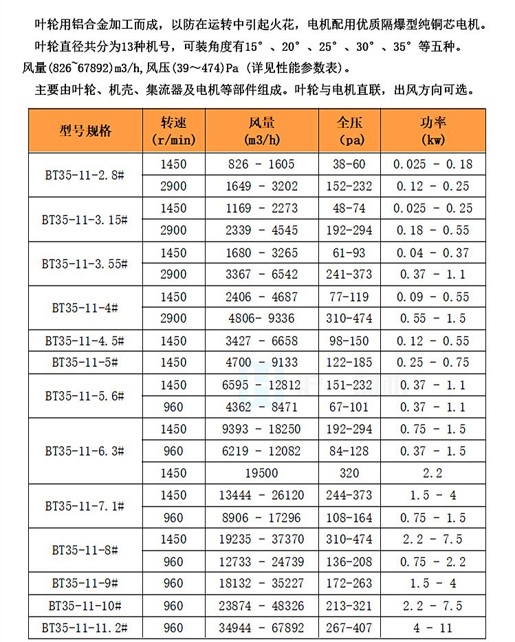 BT35-11系列防爆轴流风机为T35-11的派生产品,BT35-11圆通型轴流防爆吸风机、送风机其防爆标志为“Exd ⅡBT4 Gb"。即隔爆型IIB类电气设备,表面温度为T4组,设备保护级别“EPL Gb" ,具有“高"的保护级别,在正常运行或预期故障条件下不是点燃源。叶轮用铝合金加工而成,以防在运转中引起火花,浙江BT35-11防爆轴流风机批发的电机配用隔爆型电机。叶轮直径共分为13种机号,可装角度有15°、20°、25°、30°、35°等五种。风量(826~67892)m3/h,风压(39~474)Pa (详见性能参数表)。主要由叶轮、机壳、集流器及电机等部件组成。叶轮与电机直联,转向为左旋(电机端看),也可按客户定制出风方向。